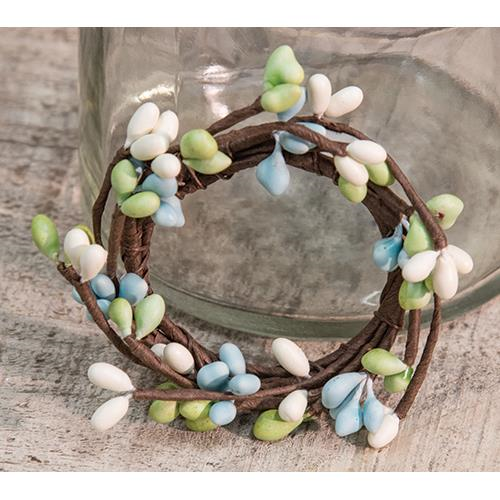 Seabreeze Mini Pip Ring features pastel shades of teal, green, and ivory pip berries. It measures 1½” in diameter.