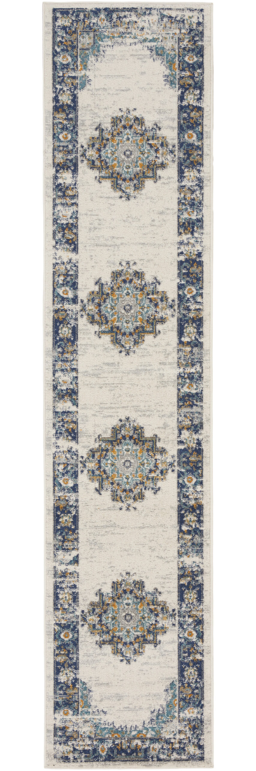 Set an inviting tone in your space with this 10-foot blue and ivory oriental distressed runner rug. Built to last, this rug crafted from polypropylene fibers is known for its durability and long lasting appeal. Rugs are a great way to showcase your style, hide imperfections, warm your home and reduce noise. This rectangular shaped rug features a abstract design that will add a functional and decorative accent to your space. This persian style runner makes a great accent for the hallway, in front of cabinets, in the laundry room, or any other space you need a narrow and long rug. 26-inch h x 120-inch w x 0.5-inch d.