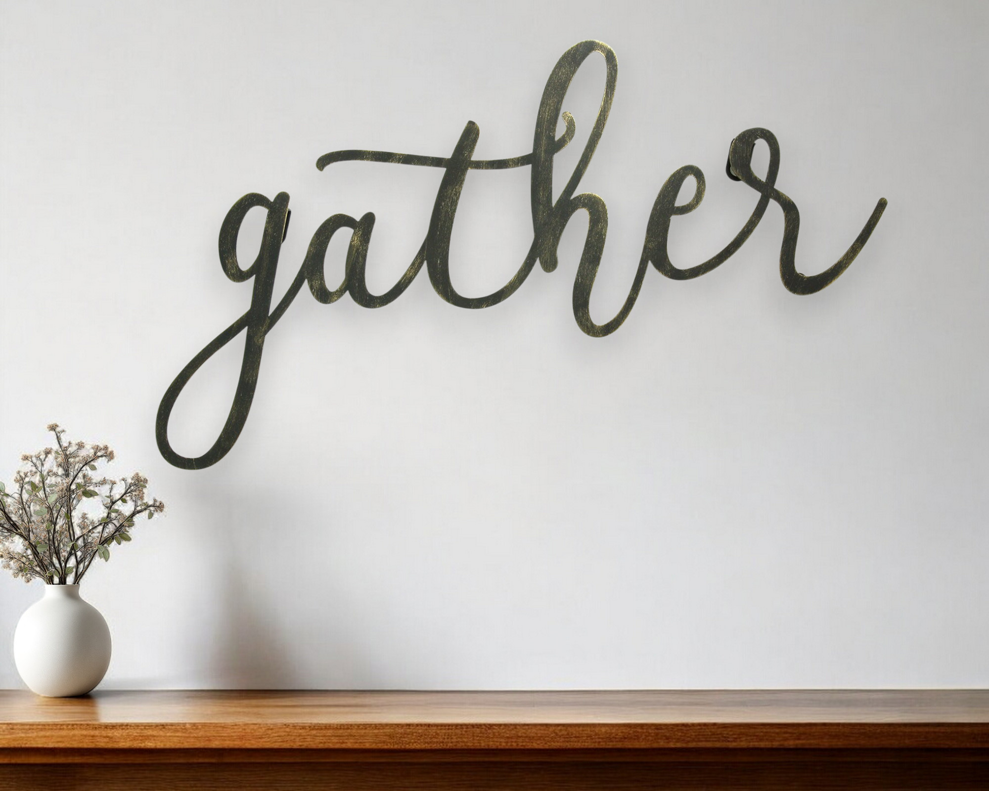 Unique and decorative, this 10-inch x 20-inch black metal gather text wall decor will leave a lasting impression. Our words matter. This typography wall art is artfully hand-crafted to add charm and sentiment to your walls. It features rustic metal script bearing the word “gather”. This sweet sentiment for your kitchen, dining room, or living room is handcrafted by skilled artisans in a black with gold undertones distressed finish. 10-inch h x 20-inch w x 1.77-inch d.