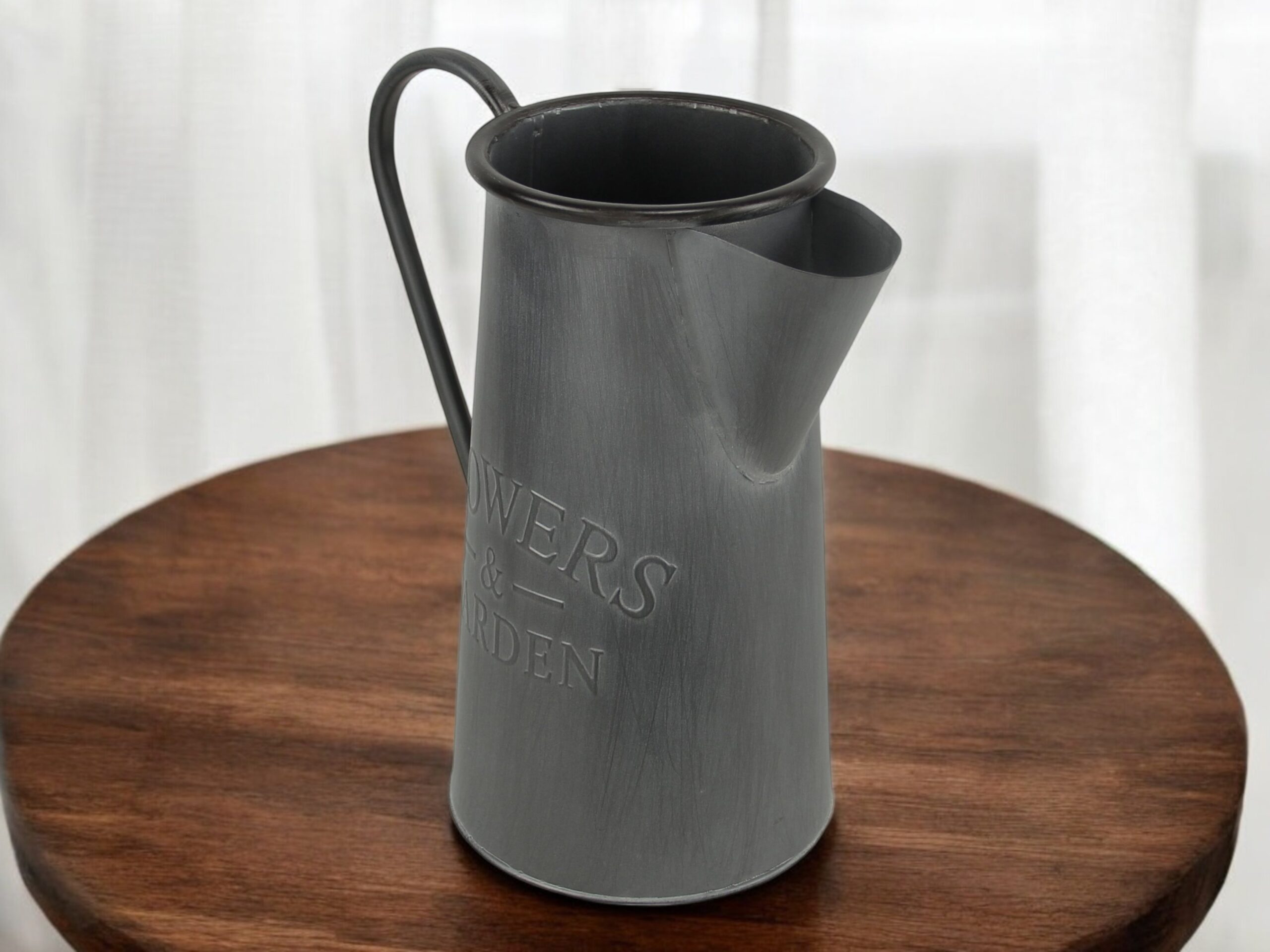 Elevate your space with the 11-inch dark gray metal jug vase, a beautifully hand-painted piece that exudes charm and elegance. Crafted from metal, this jug vase features a coat/paint distressing that adds a touch of rustic appeal to its cottage-style design. The dark gray color effortlessly complements any room decor, making it a versatile and purposeful addition to your home. Ideal for showcasing your favorite blooms or standing alone as a decorative accent, this jug vase is a must-have for those looking to add a unique and stylish element to their living space. 11-inch h x 10-inch w x 6-inch d