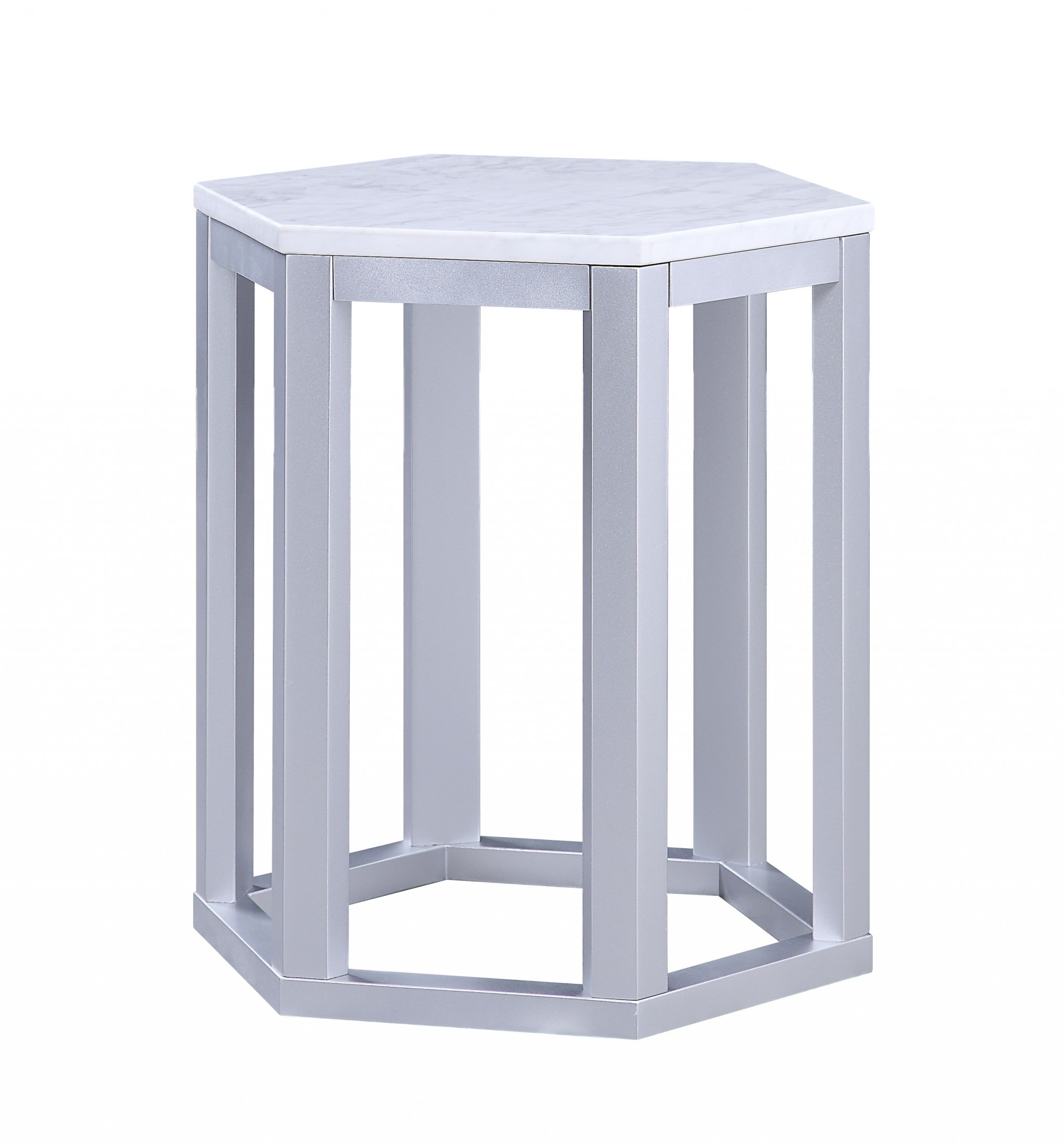 Give your room an exceptional interior design with this end table. It is crafted with durable pieces of wood and poly-resin. It features a hexagon shape and delectable marble top resting on a sturdy open wood base. These are some of the details that gives this table such an exceptional aesthetic. This table is also embellished with other intriguing trimmings that help it smoothly blend with existing decor. The table is rendered in a rich marble and gray finish. It is sleek and smoothly streamlined form is a clear reflection of excellent craftsmanship. It is available in the dimension of 16 by 18 by 20 inches.