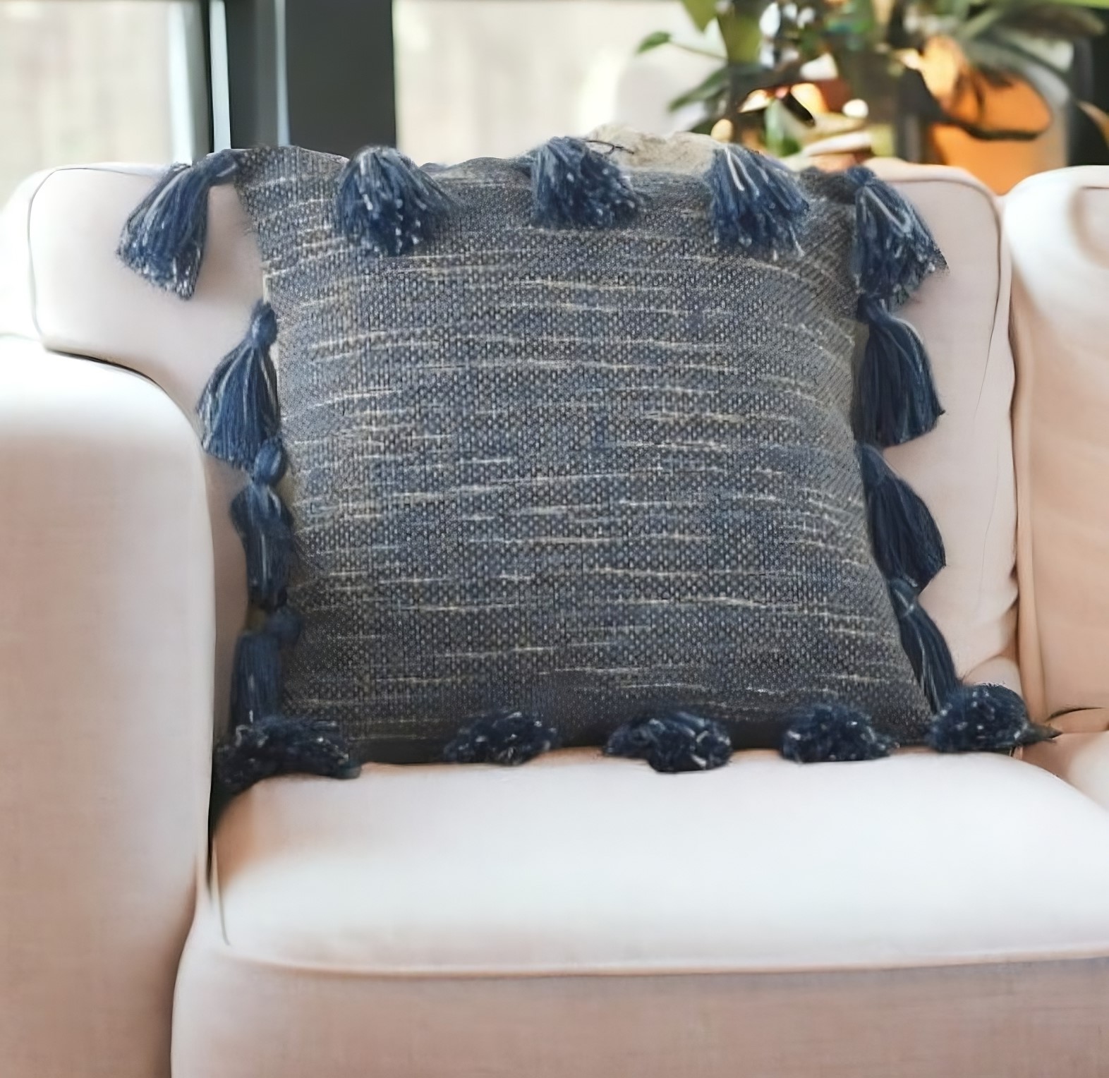 The perfect complement to your sofa, favorite chair, or bed, this 18-inch royal blue throw pillow is a great decorative accent. This pillow has a square shape and is covered in a blue with ivory and tan textured fabric. The texture on this fabric has a weave design which has veining through it. Around the perimeter of this pillow there are large floppy tassels which add depth to the overall look. 18-inch H x 18-inch W x 5-inch D