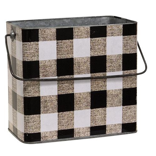 Nesting Metal Black & White Check Buckets are galvanized metal canisters with a black and white buffalo check pattern sold as a set of 2. Canister has a metal handle for easy transporting and it looks charming with a variety of florals tucked inside or various winter fillers like pine cones and baubles. Measures 6.5″ high by 7″ wide by 4.25″ deep and 4.25″ high by 4.75″ wide by 3.75″ deep.