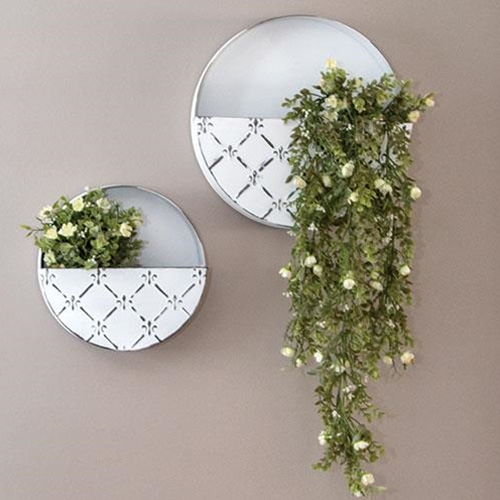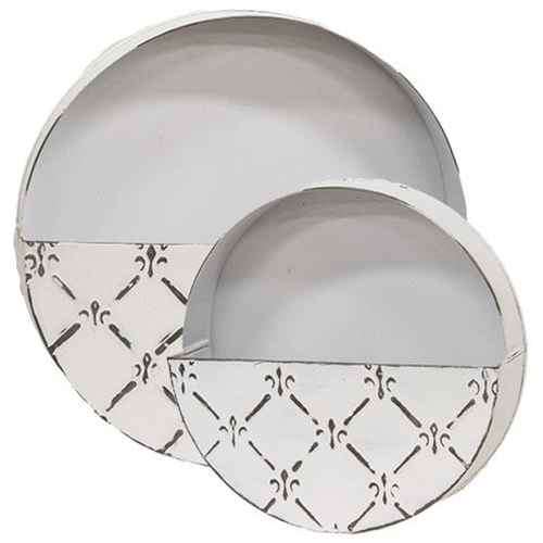 Whitewashed Galvanized Fleur de Lis Wall Pockets bring an elegant accent to farmhouse decor. Made from metal, the round wall pockets feature a distressed white finish for a rustic look. A geometric Fleur de Lis pattern adorns the front panel of each pocket, making a perfect accent for florals and other decor. A keyhole hanger on the back of each allows for easy display. The small pocket measures 9.25” in diameter by 2.75” deep, and the large pocket measures 12” in diameter by 3” deep.