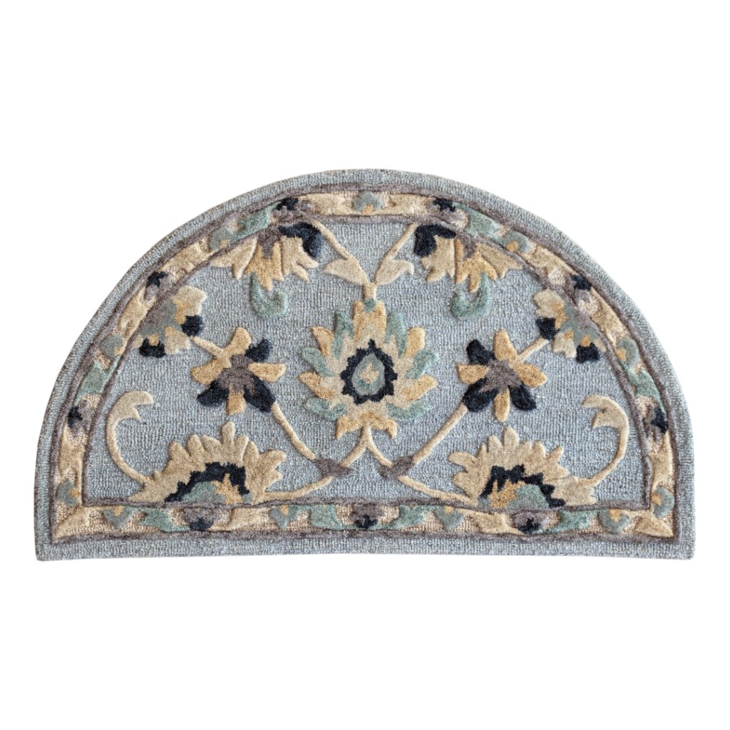 Embodying the art of traditional luxury with a modern flair, this Blue and Beige Floral Hearth Rug will be an eye-catching element to any contemporary or customary home. The lovely floral vines in beige and black add a subtle contrast and texture to the soft blue backdrop. Designed in a half-circle to be placed before a fireplace, this rug is handmade with 100% wool and cotton backing that speaks of its durability and strength to shield the floor against fire sparkles, hot soot, and more. Beautiful and practical with traditional patterns in a modern palette, this stunning hearth rug will be a worthy decorative accent to allure the gaze of the guests. 27” x 46” x 0.5”