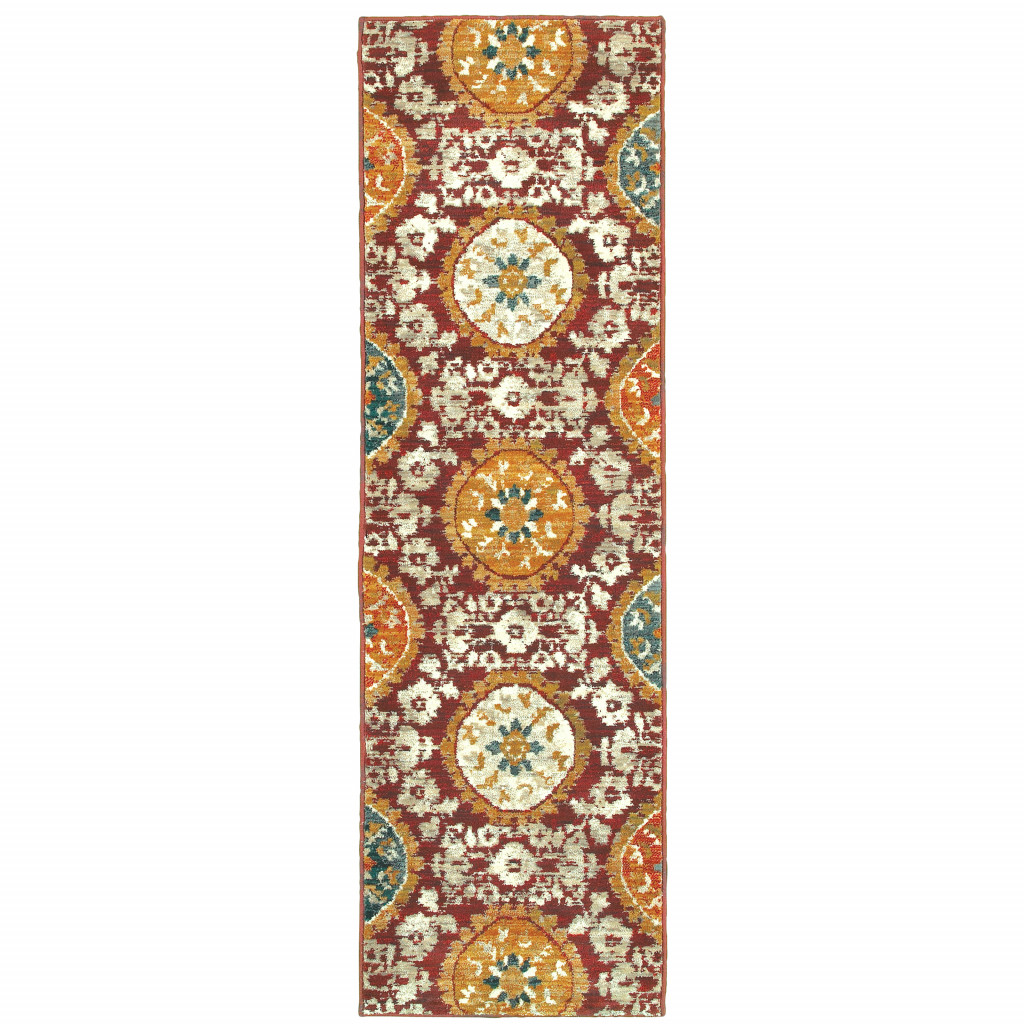 2′ X 8′ Red Gold Teal Grey Ivory And Blue Oriental Power Loom Stain Resistant Runner Rug