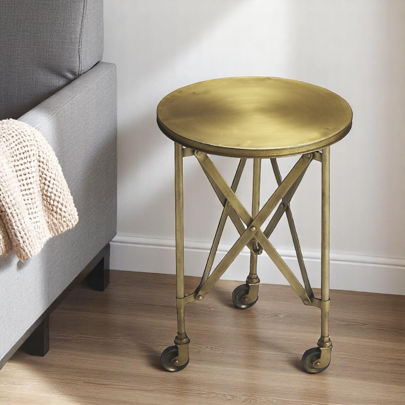 24″ Antiqued Gold Iron Round Rolling End Table