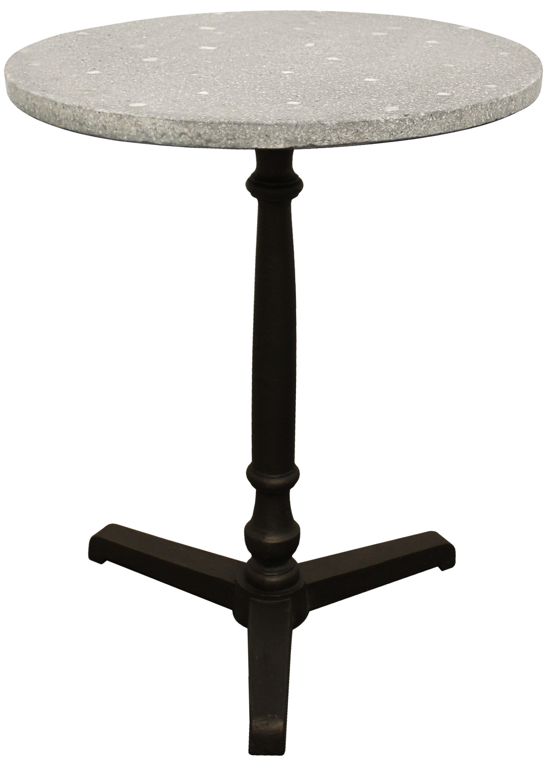 Enjoy making memories around this gorgeous 24″ gray and black rounded stone and iron dining table. A black iron frame is finished off with a gray stone top that is the epitome of quality construction and design. The two-tone finish adds to it’s appeal. A beautiful three legged pedestal base adds some dimension and elegance to your dining. This bistro dining table seats 2 people comfortably. Complete your kitchen or dining room with this well made and stylish table. The dining table is a symbol for togetherness, special meals, and conversation. This 24″ gray and black rounded stone and iron dining table is a must-have for your home. 30″ H x 24″ W x 24″ D