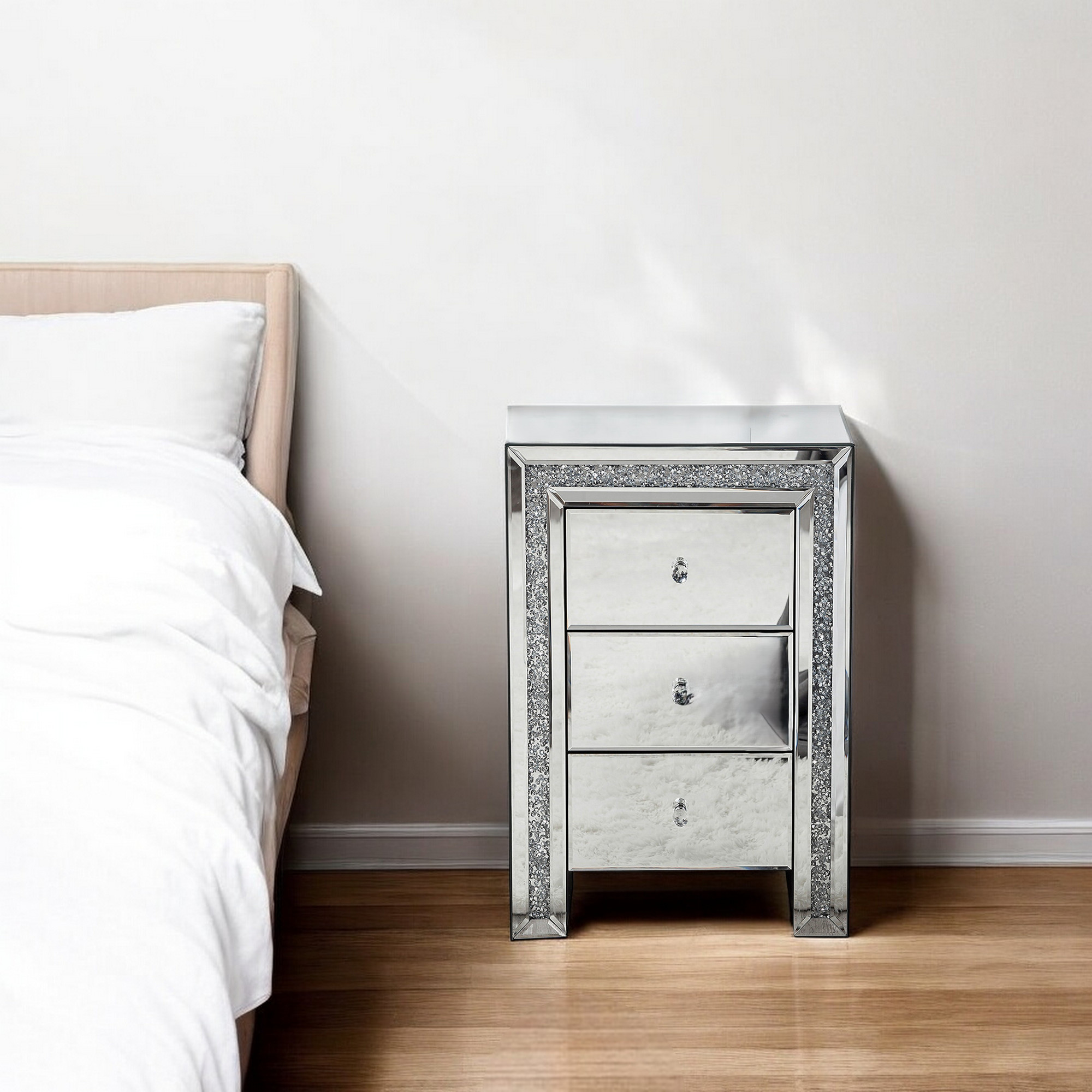 27″ Silver Wood and Mirror And Mirrored Glass Three Drawer Nightstand