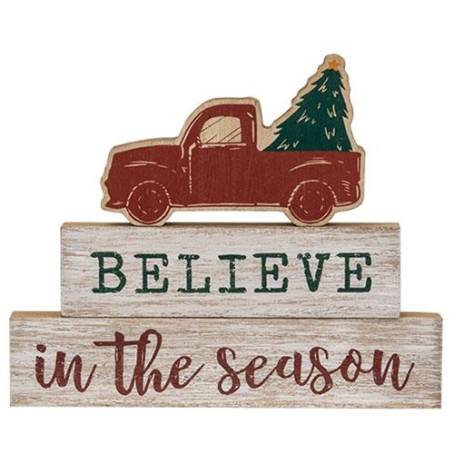 Believe In the Season Truck Stackers is a set of three freestanding wood blocks with a wooden truck cut-out as a topper. When paired together blocks read, “believe in the season” in red and green lettering over a distressed white finish and measures 6″ high by 7″ wide by .75″ deep when stacked.