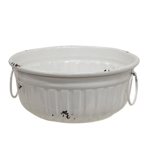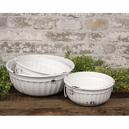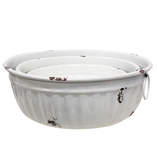 Distressed White Metal Bowls is a set of three antiquated white nesting bowls with simple impressions around the outside. Each bowl comes with two circular white handles attached on opposite ends. Use these bowls to display fruit or baked goods in the kitchen or fill with greenery and florals. Small bowl measures 8.5” in diameter and 3.75” high. Medium bowl measures 10” in diameter and 4” high. Large bowl measures 12” in diameter and 5” high.