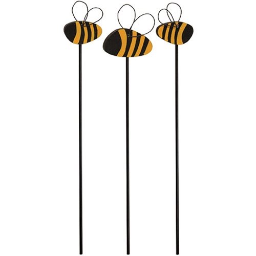 The Bumblebee Plant Pokes are a set of three decorative wooden plant stakes with a black metal base. The pokes feature a striped bumblebee figurine, complete with curled black wire wings. These bees dress up any house plant or potted outdoor plant with a charming springtime look. Each poke measures 11” high.