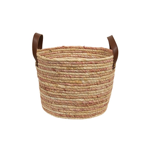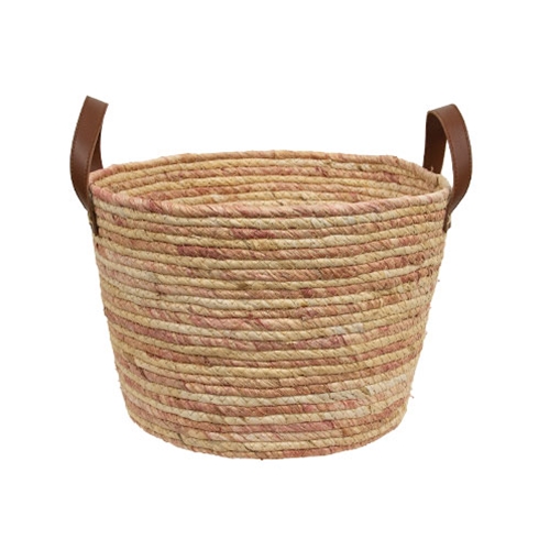 Woven Natural and Rose Seagrass Baskets make a unique and practical addition to a home decor collection. Made from woven seagrass, the baskets have a rustic look accented by natural beige and soft pink hues. Each basket has a round shape and 2 convenient leather handles. Perfect for holding blankets, floral arrangements, and other items, the baskets can nest together for streamlined storage. The smallest basket measures 7” high by 10” in diameter, the medium basket measures 8” high by 11” in diameter, and the largest basket measures 8.5” high by 12” in diameter.