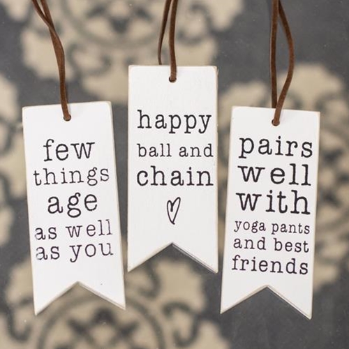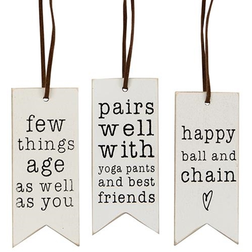 These fun and quirky wine tags sell as a set of three. With a banner shape, the wooden tags each come with a faux-leather hanger and are printed with the phrases “Few things age as well as you,” “Pairs well with yoga pants and best friends,” and “Happy ball and chain.” The back of each is printed with the words “To” and “From” to make gifting a breeze. 4″ high by 1.75″ wide.