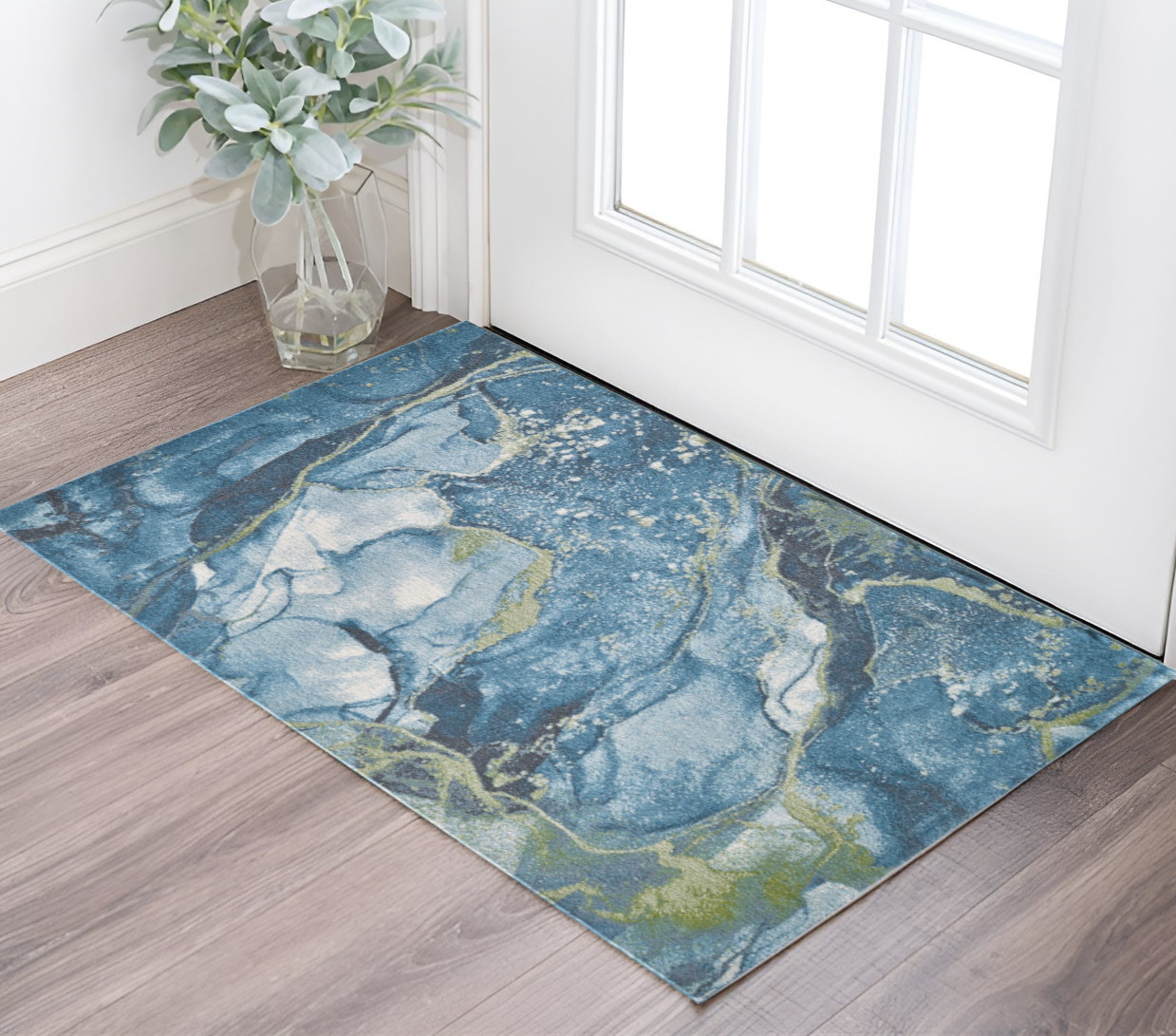 Add some artistry to your room with this 3-foot x 5-foot teal blue abstract area rug. This rectangle shaped rug features a abstract design in teal blue to give it visual interest. A classic shape marries with good looking design for your space ideal for spaces with kids and pets, this rug is stain resistant to help repel stains and spilled liquids. Area rugs help to give warmth and sense of home to your space. 39-inch H x 59-inch W x 0.5-inch D