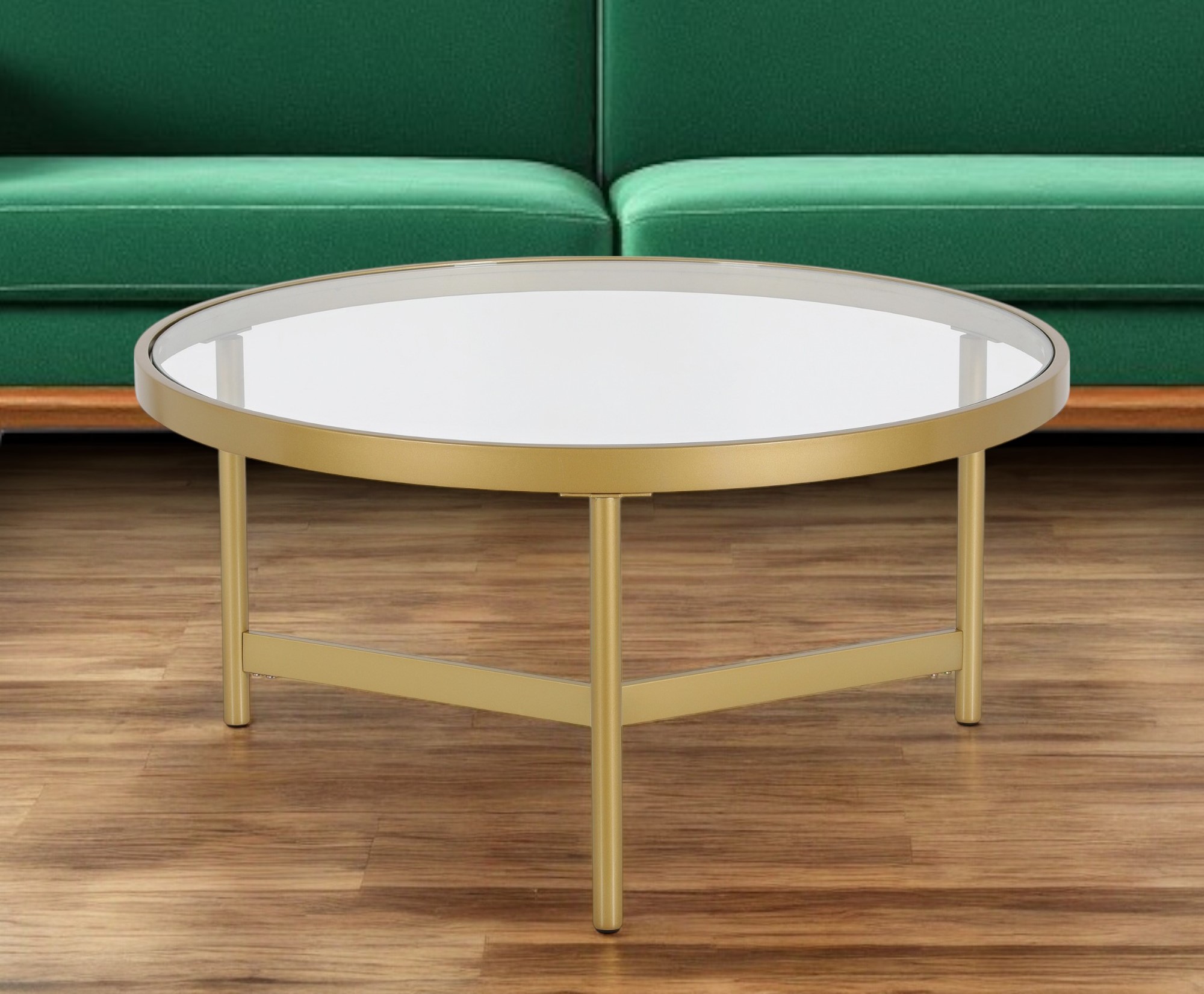 This good looking 32-inch gold glass and steel round coffee table is sure to inspire compliments no matter where it sits. A gold coloration runs throughout this good looking steel and glass table. This round table utilizes its unique shape to give your room a modern geometric accent. If you’re looking for something that can fit into a living area, bedroom, or office, this coffee table is for you. This coffee table is the sturdy, reliable and stylish answer to your living room needs. 16-inch H x 32-inch W x 32-inch D