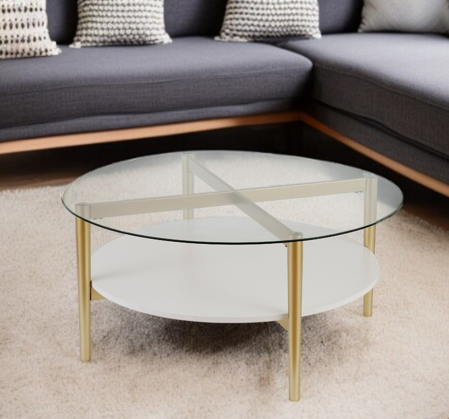 Stylish and super sturdy, the 36-inch clear and gold glass and steel round coffee table with shelf is an amazingly good looking coffee table that will compliment your living room. Quality construction from the gold steel base combines with clear glass of the top to give this table a fresh and updated look. Includes a single shelf for handy storage or display space. This round table features a fresh and stylish shape to give your room a visually pleasing accent. It has a fresh design that will definitely breathe some fresh air into your interior. This coffee table is the sturdy, reliable and stylish answer to your living room needs. 17-inch H x 36-inch W x 36-inch D