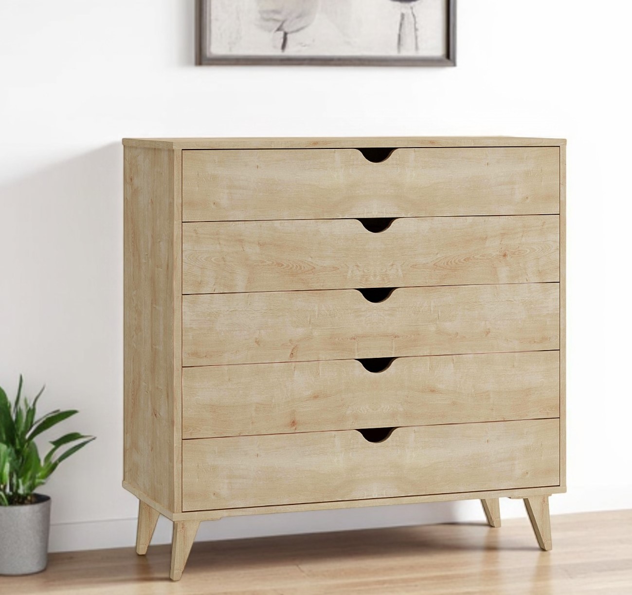 Enhance your room into a visually delightful and highly functional space with this 36-inch natural wood five drawer dresser. This vertical standard dresser has a convenient and wide top area for your getting ready needs and supplies. Equipped with five easy open drawers for practical and good looking clothing storage. This dresser is made from sturdy manufactured wood that is built to last. The natural coloration of this piece is neutral and will blend easily with most any decor. 36-inch h x 36-inch w x 16-inch d.