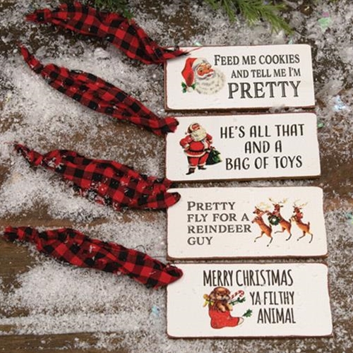 4/Set, Christmas Present Wooden Gift Tags are made of wood and feature a red and black buffalo check hanger for immediate display. They look darling on a tree or hung from a nail or knob and read, “He’s all that and a bag of toys,” “Pretty fly for a reindeer guy,” “Feed me cookies and tell me I’m pretty,” and, “Merry Christmas ya filthy animal” in bold lettering. Tags are accented by holiday graphics and measure 3.5″ wide by 1.75″ high.