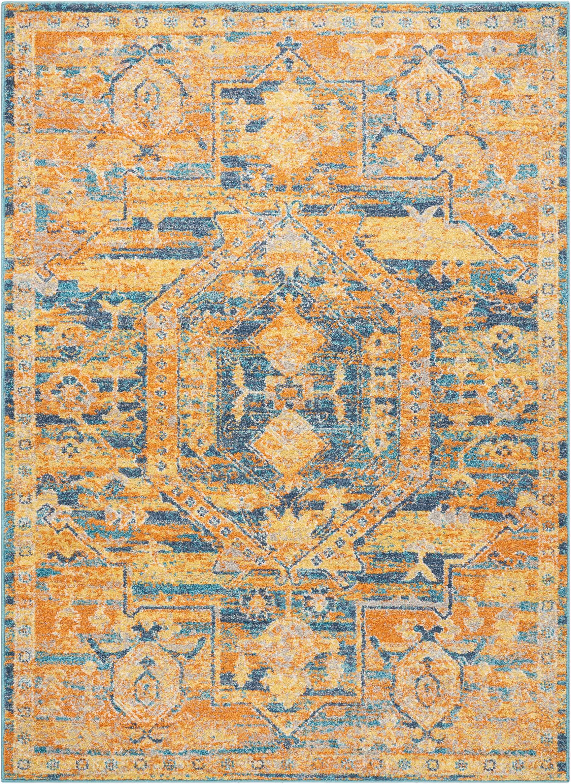 Add some artistry to your room with this 4-foot x 6-foot teal and gold medallion distressed area rug. Built to last, this rug crafted from polypropylene fibers is known for its durability and long lasting appeal. Rugs are a great way to showcase your style, hide imperfections, warm your home and reduce noise. This smaller sized, traditional styled rug is just what you need for your walkway, bedside, in front of door, cabinet, refrigerator, or chair. 45-inch h x 69-inch w x 0.5-inch d.