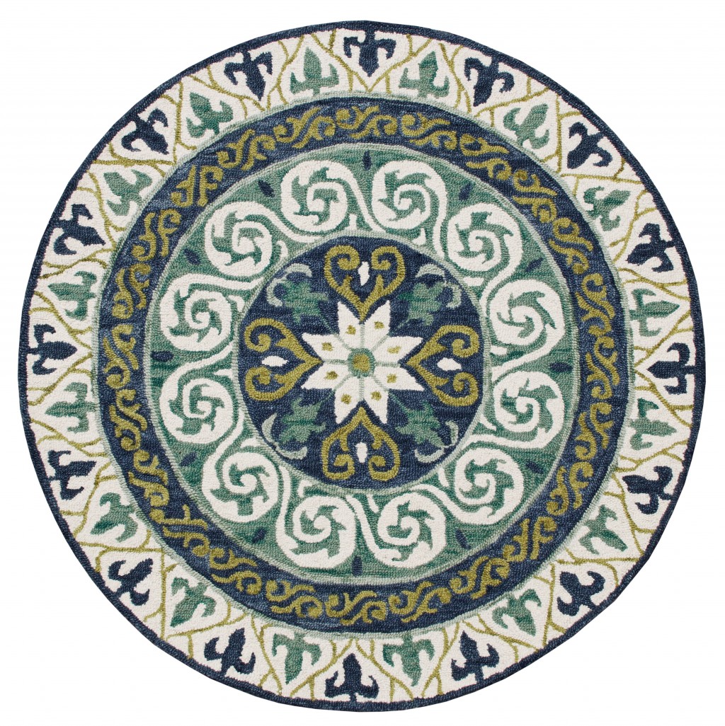 5′ Round Blue and Green Ornate Medallion Area Rug