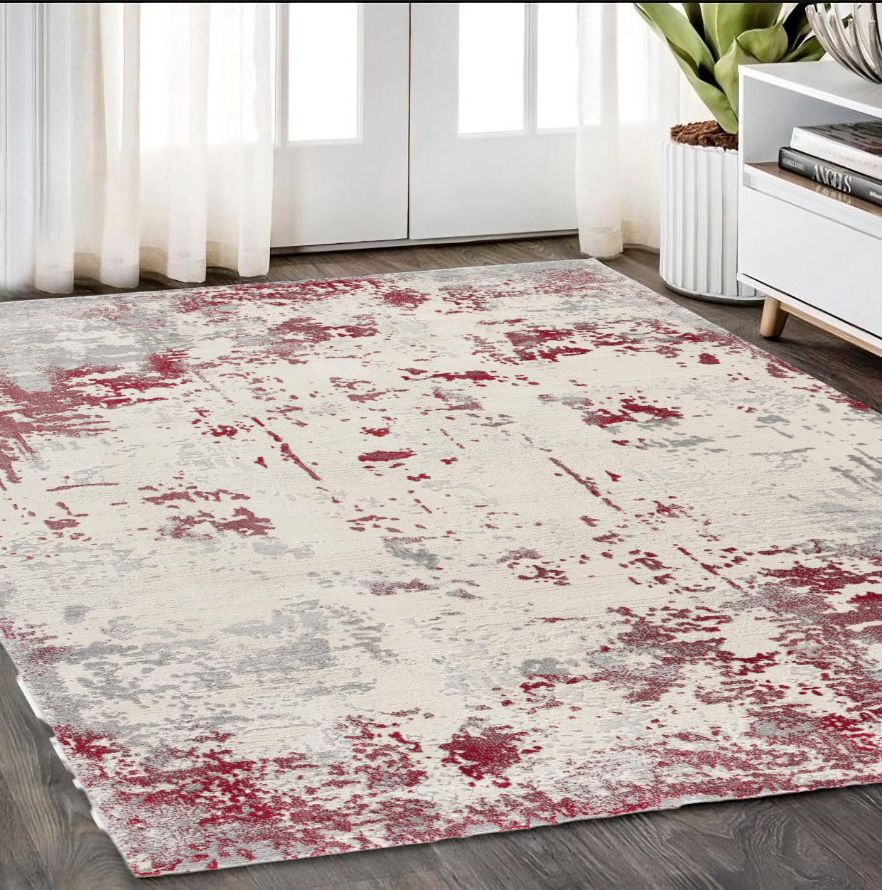 Set an inviting tone in your space with this 5-foot x 7-foot gray and red abstract distressed area rug. Ideal for spaces with kids and pets, this rug is stain resistant to help repel dirt and spilled liquids. Built to last, this rug crafted from polypropylene fibers is known for its durability and long lasting appeal. Rugs are a great way to showcase your style, hide imperfections, warm your home and reduce noise. This larger sized, modern styled rug is ready to create a focal point or statement piece in your room. 63-inch h x 91-inch w x 0.8-inch d.