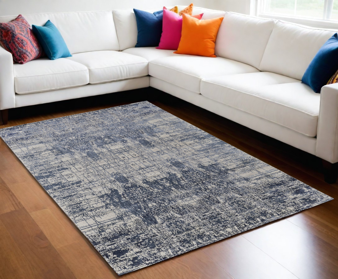 This 5-foot x 8-foot blue and ivory abstract hand woven worn faded area rug, is a great way to add warmth to a room. This rectangle shaped rug features a abstract design in blue and ivory to give it visual interest. A classic shape marries with good looking design for your space crafted by skilled artisans, this hand woven rug is genuine and unique. No two will be exactly alike. Area rugs help to give warmth and sense of home to your space. 60-inch H x 96-inch W x 0.39-inch D