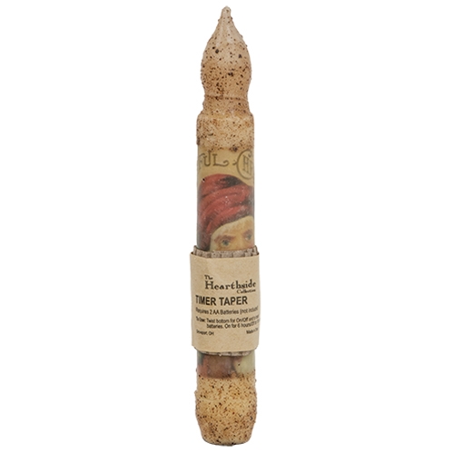 Joyful Santa Timer Taper has a grungy, burnt ivory wax coating. The center portion of the taper is embedded with the image of Santa and the phrase, “Joyful Christmas.” It has a built-in timer function that keeps the candle lit for 6 hours, then off for 18 hours. Requires 2 AA batteries (not included). Measures 6″ high.