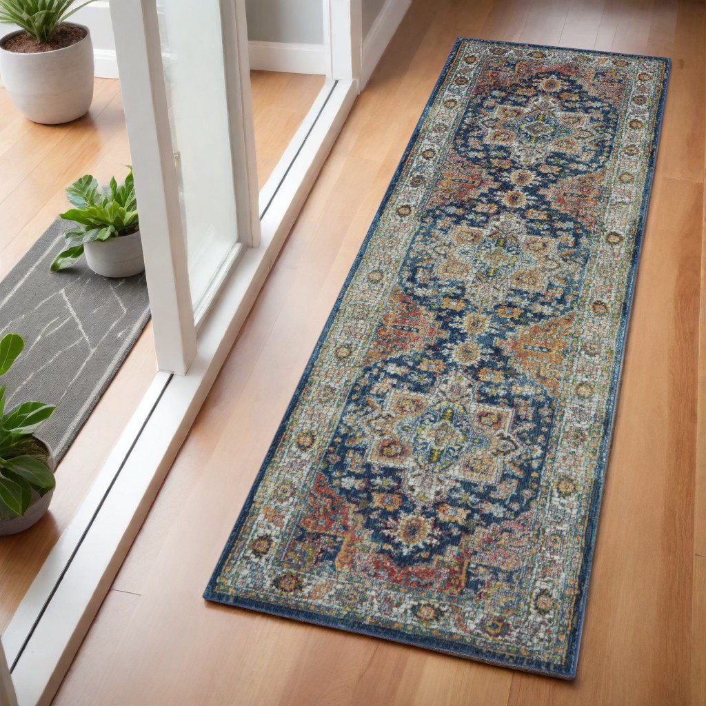 Set an inviting tone in your space with this 6-foot ivory blue and orange floral distressed non skid runner rug. Built to last, this rug crafted from polypropylene and polyester blend fibers is known for its durability and long lasting appeal. Rugs are a great way to showcase your style, hide imperfections, warm your home and reduce noise. This rectangular shaped rug features a abstract design that will add a functional and decorative accent to your space. This transitional styled runners makes a great accent for the hallway, in front of cabinets, in the laundry room, or any other space you need a narrow and long rug. 24-inch h x 72-inch w x 0.5-inch d