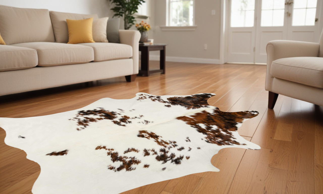 Set an inviting tone in your space with this 6-foot x 7-foot brown and white cowhide area rug. Crafted from cowhide fibers that give this piece premium texture, refinement, and appeal. Rugs are a great way to showcase your style, hide imperfections, warm your home and reduce noise. This larger sized, contemporary styled rug is ready to create a focal point or statement piece in your room. 72-inch h x 84-inch w x 0.25-inch d.