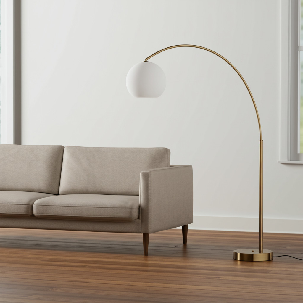 This 75-inch brass steel arc floor lamp with white glass globe shade is a great way to add some brightness to any corner of your home. The base of this lamp is made of steel finished in a steel tone. The lamp shade itself has a globe shape and is made of glass, which makes it a perfect choice. A great way to shed light over those hard to reach areas, this arched floor lamp has a single base with straight pole that extends upwards and a long curving arm. High quality design makes this a great lamp for not only lighting, but accenting a room with style. It is perfect for virtually any decor. 75.2-inch h x 65.7-inch w x 13.6-inch d.