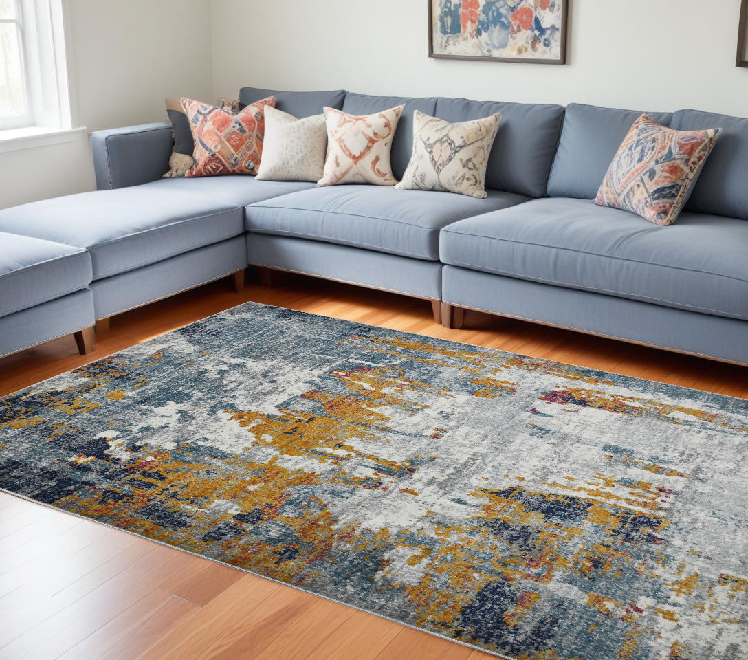 Set an inviting tone in your space with this 8-foot x 11-foot blue and orange abstract power loom area rug. This rectangle shaped rug features a abstract design in blue and orange to give it visual interest. A classic shape marries with good looking design for your space ideal for spaces with kids and pets, this rug is stain resistant to help repel stains and spilled liquids. Place this area rug against a hardwood or tile floor and it will enliven your living space with style and sophistication. 94-inch H x 130-inch W x 0.38-inch D