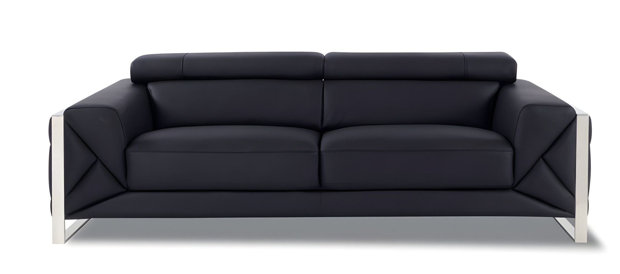 Made of the highest quality, supple leather, this 89-inch black italian leather sofa with silver legs will be the star of your space. The high grade premium leather used makes your lounging luxuriously comfortable and adds an elegant appeal to your space. Solid colors give you lots of decorative options and are easy to work into your decor scheme. Web suspension construction gives this piece strong support and makes it comfortable to sit even for long periods of time. Square arms offer a comfy place to rest. Silver chrome legs effortlessly elevate the room and add a touch of contemporary design. A great showpiece for your room, this sofa is a must have. 35-inch H x 89-inch W x 43-inch D
