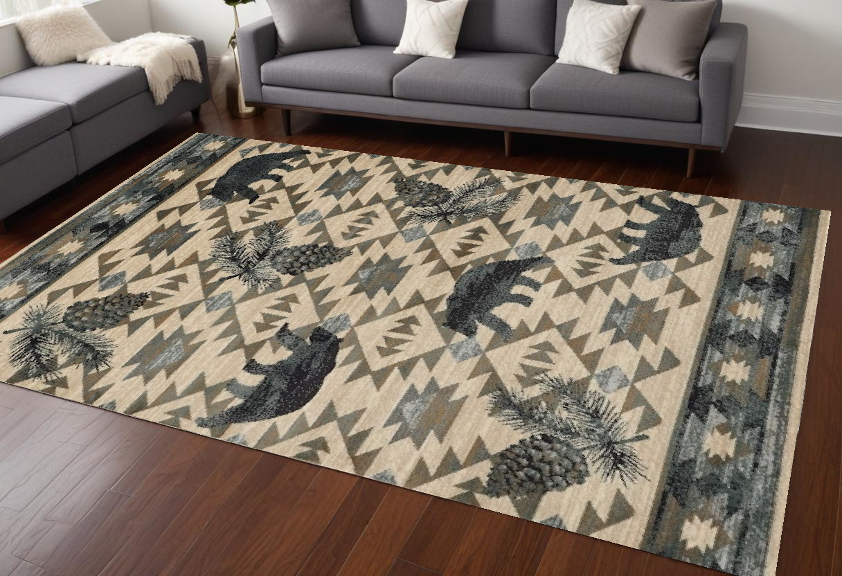 Add some artistry to your room with this 9-foot x 12-foot ivory blue and green woodland lodge area rug. Ideal for spaces with kids and pets, this rug is stain resistant to help repel dirt and spilled liquids. Built to last, this rug crafted from polypropylene fibers is known for its durability and long lasting appeal. Rugs are a great way to showcase your style, hide imperfections, warm your home and reduce noise. This larger sized, contemporary styled rug is ready to create a focal point or statement piece in your room. 108-inch h x 144-inch w x 0.5-inch d.