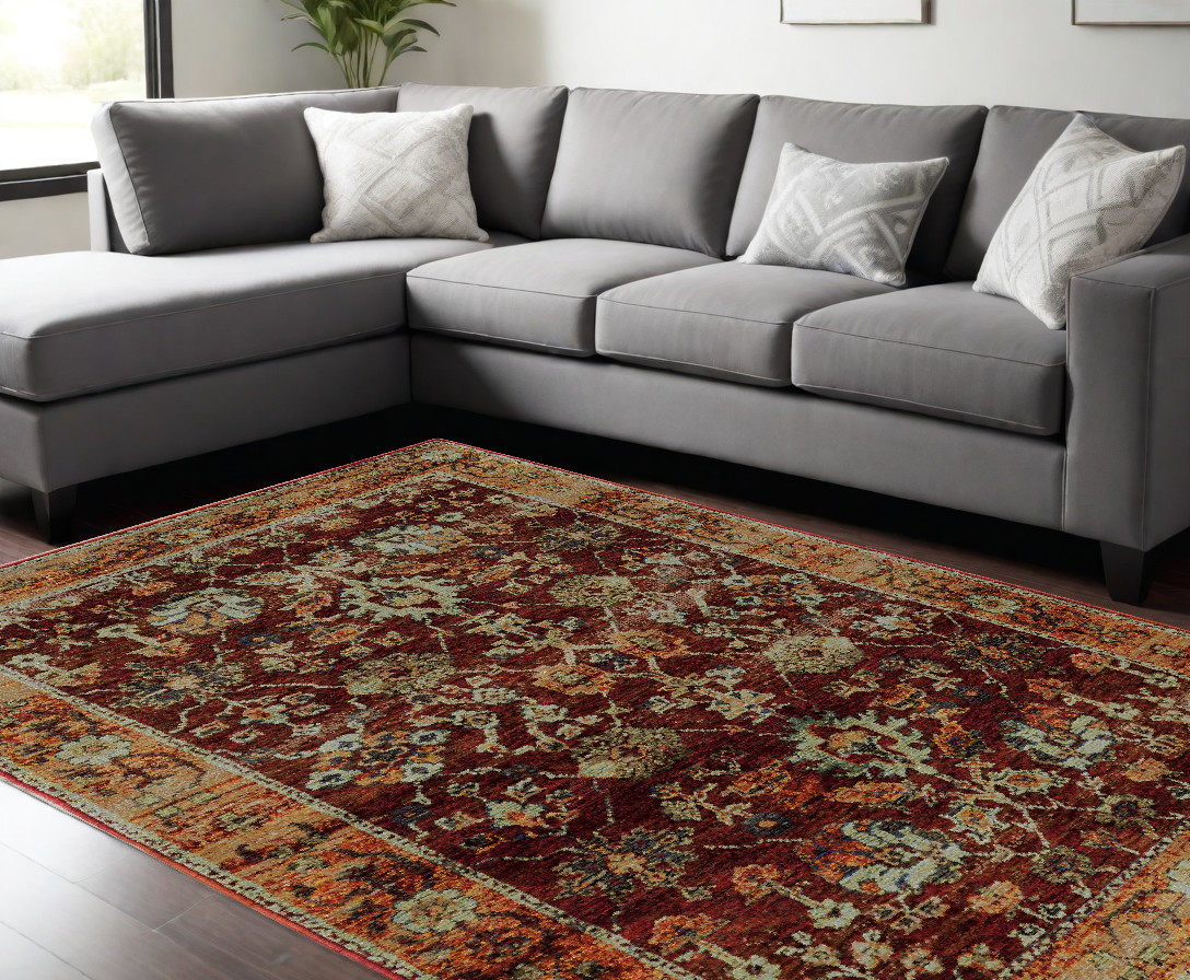 Add some artistry to your room with this 9-foot x 12-foot red and gold oriental power loom area rug. This rectangle shaped rug features a oriental design in red and gold to give it visual interest. A classic shape marries with good looking design for your space ideal for spaces with kids and pets, this rug is stain resistant to help repel stains and spilled liquids. Place this area rug against a hardwood or tile floor and it will enliven your living space with style and sophistication. 102.36-inch H x 145.67-inch W x 0.55-inch D