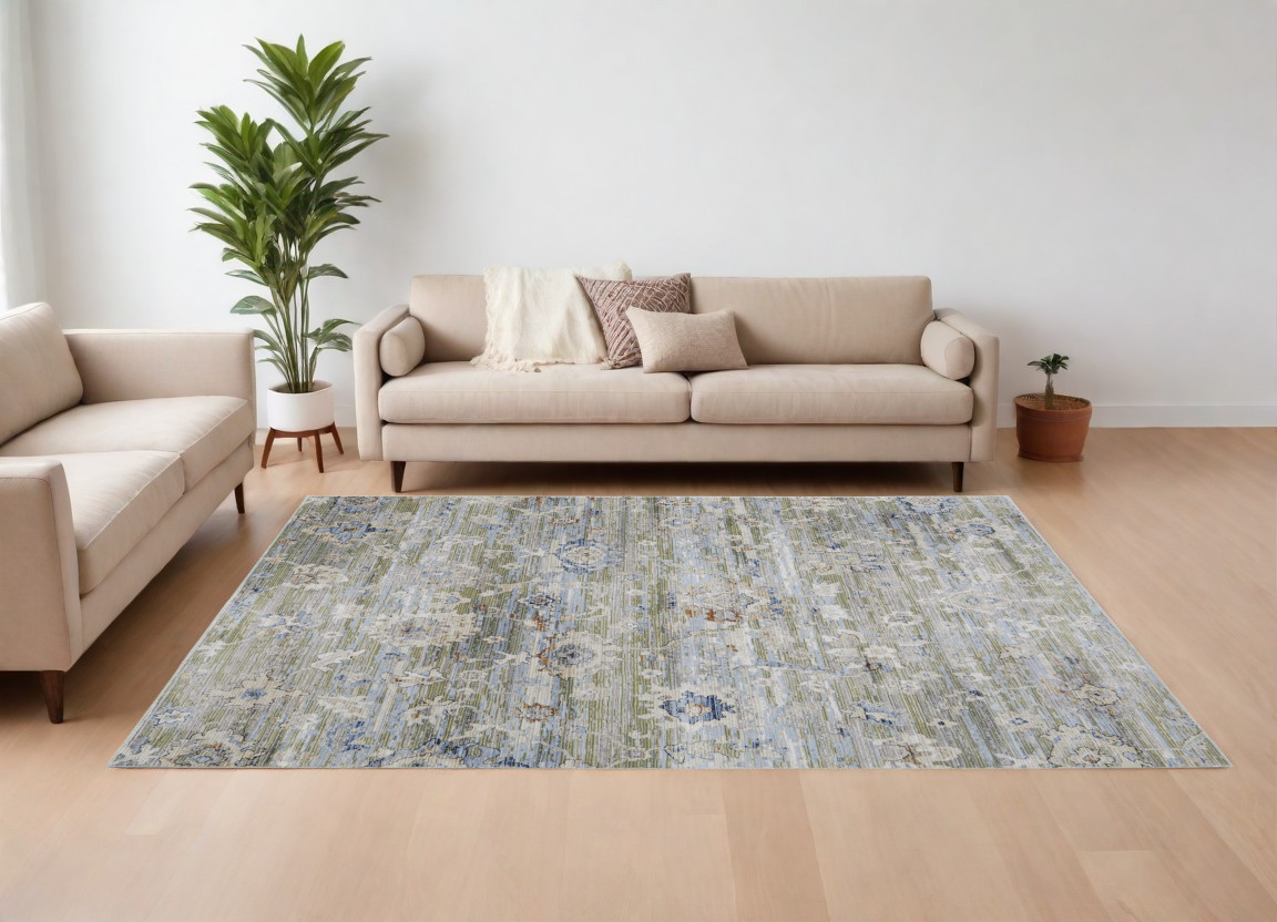 Add some artistry to your room with this 9-foot x 13-foot ivory green and blue floral power loom worn faded area rug. This rectangle shaped rug features a floral design that will add a functional and decorative accent to your space. Ideal for spaces with kids and pets, this rug is stain resistant to help repel dirt and spilled liquids. This larger sized rug is ideal to create a focal point or statement piece in your room. 108-inch h x 152-inch w x 0.47-inch d