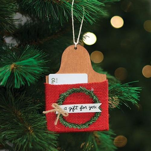 This cutting board ornament features red burlap with a mini wreath and a wooden banner that reads, “a gift for you.” There is room on the cutting board to personalize with a name or message. This unique piece includes a jute string for hanging or attaching to a gift bag. Measures 5″ high by 3.5″ across by 0.25″ deep.