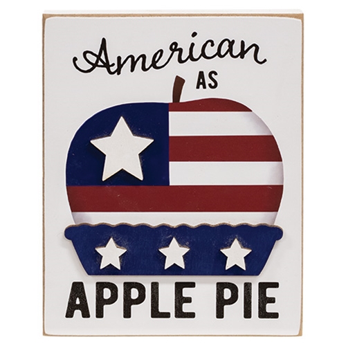 The American as Apple Pie Wooden Block Sign brings a sweet accent to summertime decor. The block sign features a white background with lightly distressed edges for a rustic touch. Layered cutout wood design makes up a unique apple and pie design with a navy and red stars and stripes-inspired look. Black text reads “American as apple pie” in a mix of script and print font. The block is freestanding for stable display on a flat surface. Measures 6″ high by 4.5″ wide by .5″ deep.