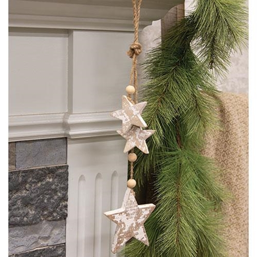 The Beaded Triple Star Hanger is a decorative knot of jute rope, strung with round wooden beads and featuring wooden star charms, complete with a brushed white finish. This hanger brings a rustic touch to the home during Winter and Christmas, displayed hanging on a Christmas tree, shelf, mantle, or other space. Measures 18” long.