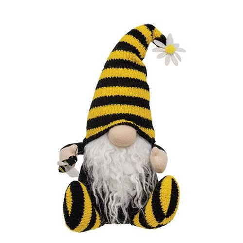 Bee Happy Sitting Gnome is a standing plush gnome with a bee-themed design. The gnome wears a yellow and black striped cap that is tipped with a white daisy, alongside matching striped booties. He also holds a bee friend in one hand. Measures 17″ high by 7″ wide and 6.5″ deep.