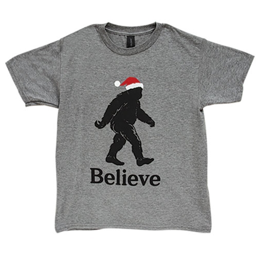The Believe Santa Bigfoot T-Shirt brings playful style to festive ensembles. Made from a comfortable cotton blend, this tee features a neutral heather graphite shade. The design depicts a walking Sasquatch donning Santa’s classic hat along with black print text that reads, “believe.” The tee is available in 4 youth sizes to ensure a perfect fit. Designed and printed in Ohio.