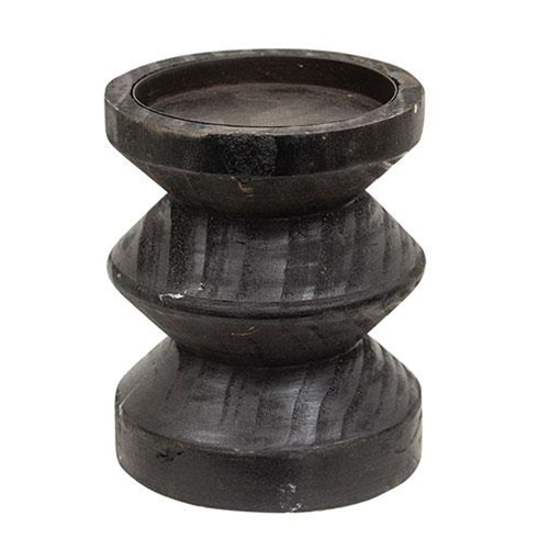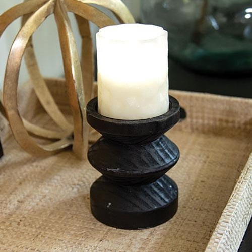 The Black Wooden Pillar Holder is a wooden carved pillar candle holder featuring black paint and a simple geometric design. The holder can be paired with a pillar candle and displayed year-round, with everyday décor, whether on a mantle, shelf, tabletop, or other flat surface. Measures 4.75″ high and 3.75″ in diameter. Fits a pillar candle up to 3″ in diameter.