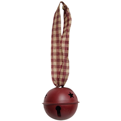Novelty Christmas bells are burgundy in color! Oversize metal jingle bell with star cut-outs and a tea-dyed gingham hanger. 2″ in diameter.