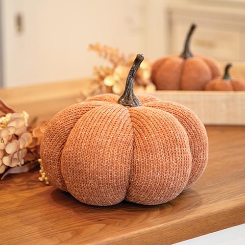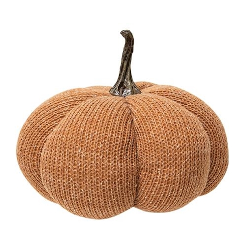 Large Burnt Orange Knit Pumpkin is a freestanding plush pumpkin with a cream-colored finish. Pumpkin has a curved plastic stem and it has ribbed detailing for a textured look. Pumpkin looks great displayed on risers, counters, or tabletops and it measures 8″ high by 9.5″ in diameter.