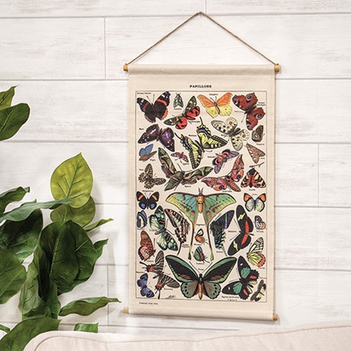 The Butterfly Wall Hanging is a decorative fabric banner poster made of taupe linen-style material. The sign is vintage-inspired, featuring academia-style artwork of butterflies in a variety of shapes, sizes, colors, and detailing. The top and bottom of the poster include wooden dowels for a weighted display. Place this banner hanging on a wall or door, using the jute hanger at the top, to bring a tasteful springtime touch to the home. Measures 24” high by 15” wide.