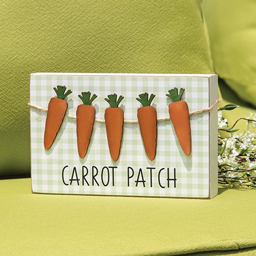 The Carrot Patch Green & White Gingham Check Box Sign is a decorative wooden box sign with white edges and a green and white buffalo check patterned background. The sign reads “Carrot Patch” in printed black lettering and features a jute garland of orange wooden carrots. This sign is charming and festive for Spring and Easter, bringing a pop of pastel inspiration displayed on a wall or tabletop. Measures 5” high by 8” wide by 1.5” deep.