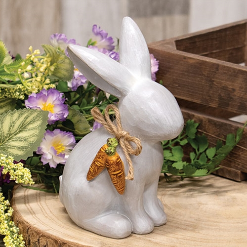The Carved Gray Bunny is a decorative bunny figurine made of durable, lightweight resin. The bunny has a carved texture and a brushed gray finish, resembling a simple cement statue, complete with a jute bow and pair of orange carrots. This bunny makes a charming accent to the home during spring, perfect for a riser, tray, shelf, or porch area. Measures 5.5” high by 3” wide by 6” deep.