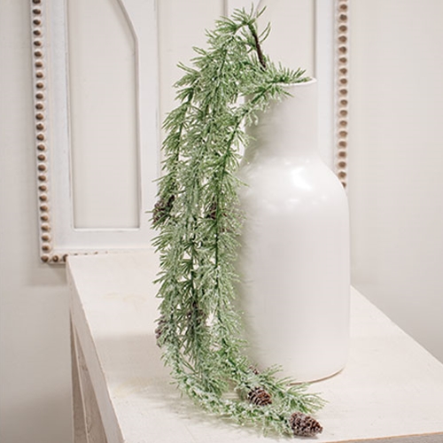 The Cascading Icy Pine Spray is a decorative greenery spray with a brown twig-like stem. The spray has long, draping branches of textured pine needles and rustic pinecones in varying sizes, all dusted with silver glitter for a freshly frosted look. Display this spray hanging, inside of a basket or pitcher, or draped across a shelf or tabletop. Measures 44” long.