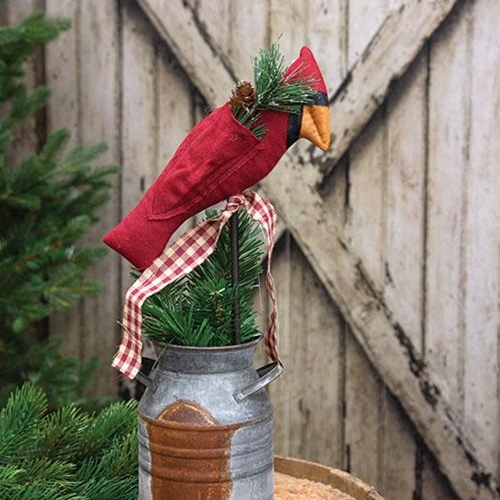 Christmas Cardinal Pick is a stuffed fabric cardinal on a wooden dowel. Cardinal has a pocket filled with glittered greenery and it is further accented by a gingham fabric bow. Pick looks great arranged with winter florals and it measures 15″ high by 7.5″ wide by 1.75″ deep.