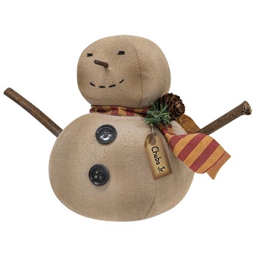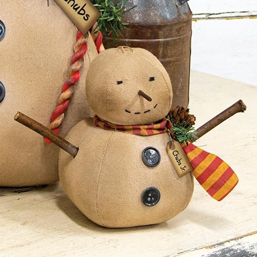 Chubs Jr. Snowman is a freestanding snowman doll with a dark, stained fabric finish. Snowman features a string hanger, stick arms and nose, black buttons, pine and pine cone spray, and a red and gold striped scarf. Snowman looks great in a Christmas display and measures 5″ high by 7″ wide by 3.5″ deep.